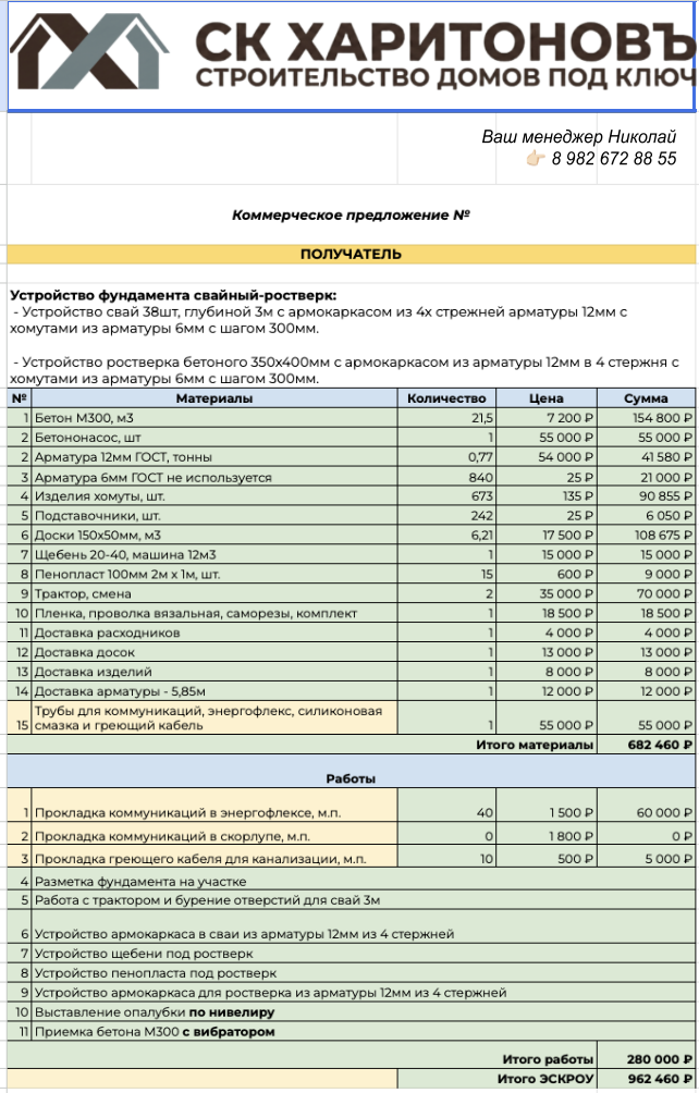 Мы посчитаем смету фундамента с учетом ваших размеров и пожеланий. Посмотрите на эскизы, если вас всё устраивает делаем чертеж и заключаем договор.